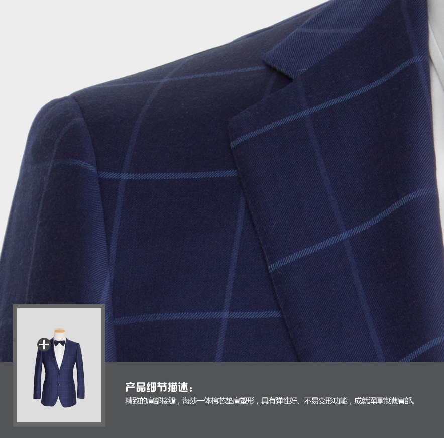 款式设计简洁大方,时尚的蓝色调格子更凸显男性的时尚态度,凸显出穿着者独特的时尚品位,会给你带来完美的穿着体验。 洗涤说明: 干洗 英国高士高弹缝纫线 德国骏马衬